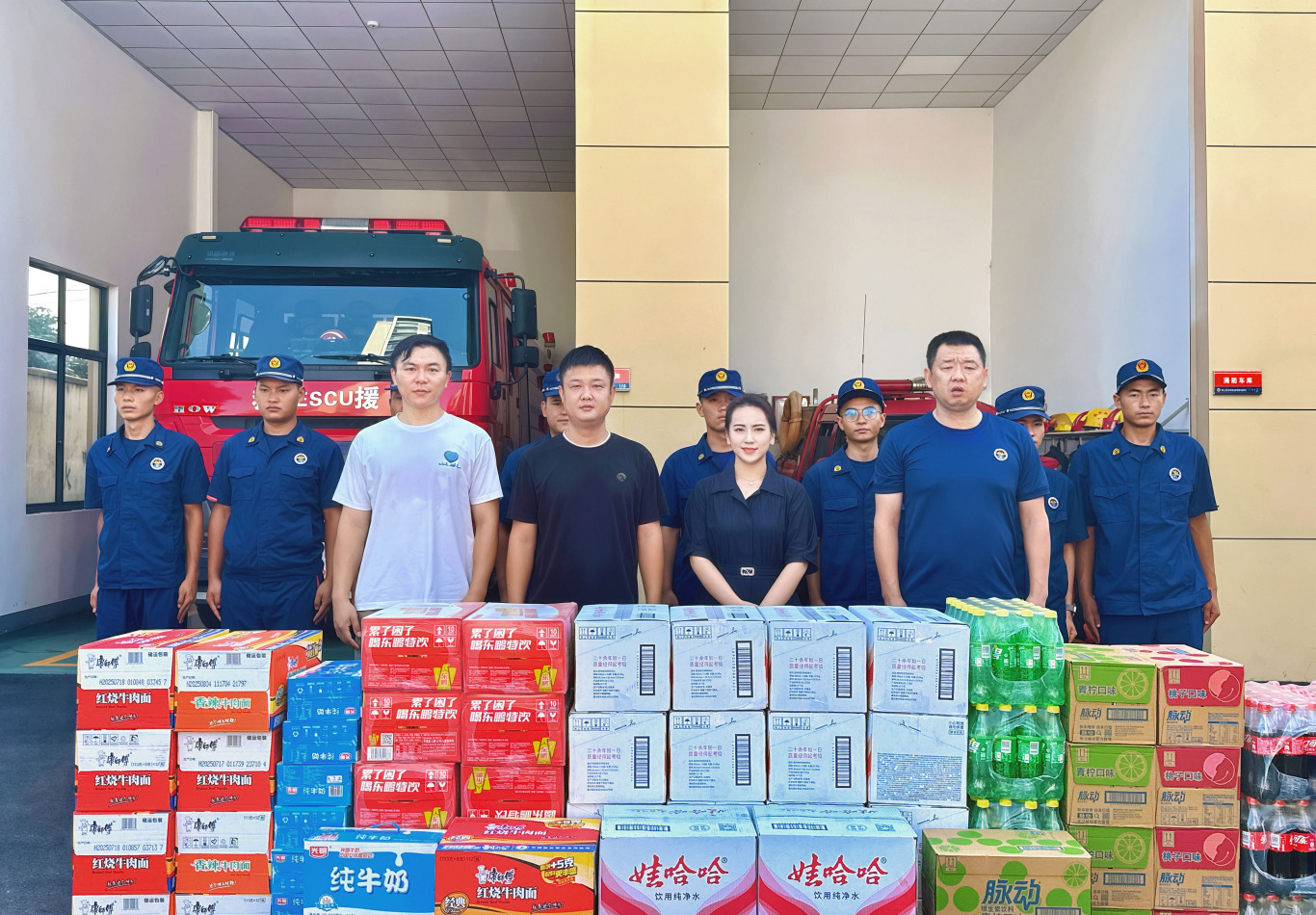 金溢建设集团总裁赵淑洋、新街镇同兴村委党支部书记李伟栋为消防员送上防暑降温物资。