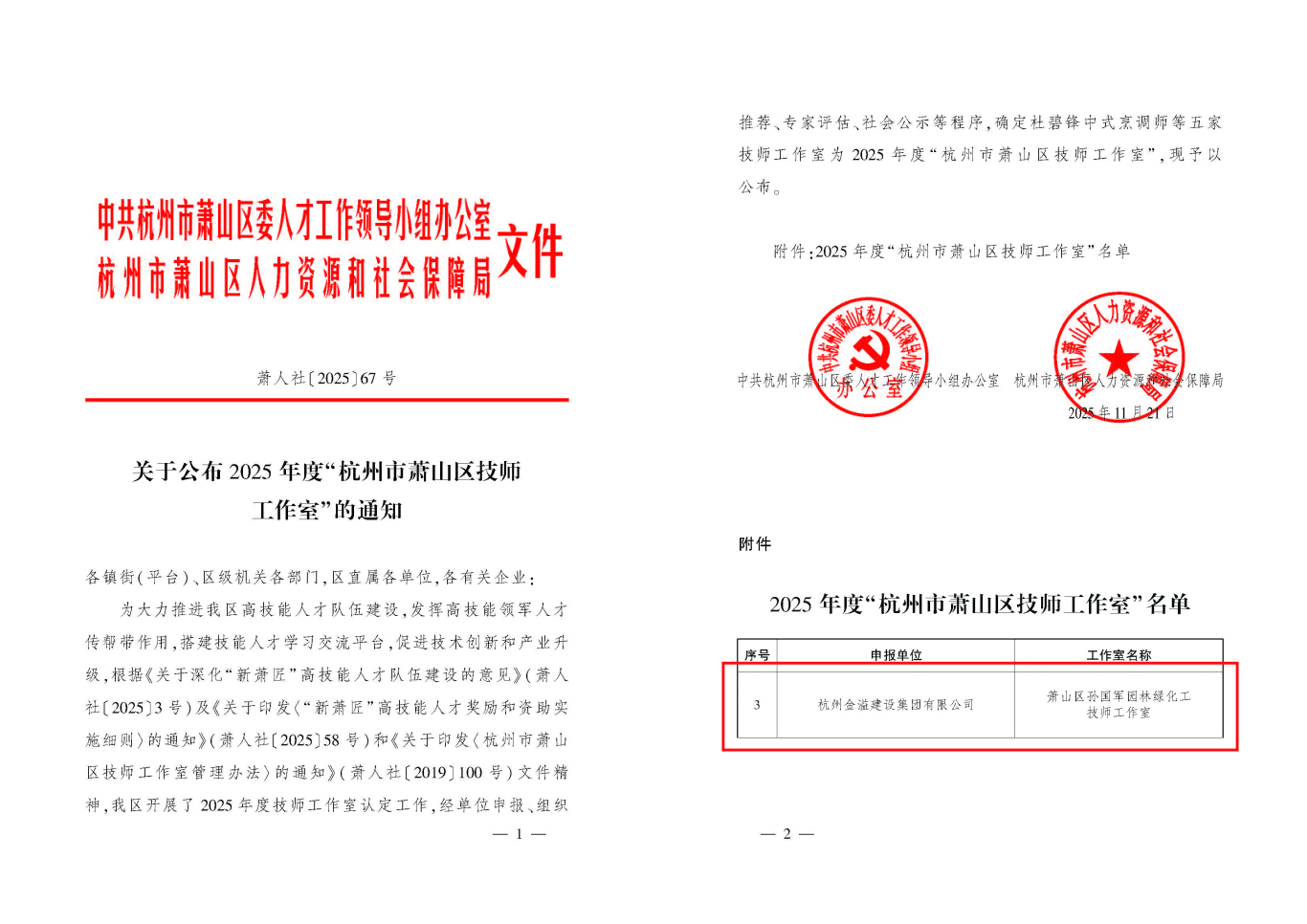 近日,中共杭州市萧山区委人才工作领导小组办公室、杭州市萧山区人力资源和社会保障局正式公布了2025年度技师工作室认定结果,评审遵循 "优中选优、精益求精" 的选拔原则,通过资料初审、现场考察、专家评审等多轮严格筛选,从技能水平、创新成果、荣誉取得、带徒成效等核心指标层层把关,确定今年全区共有5家技师工作室为2025年度“杭州市萧山区技师工作室”。 由金溢建设集团孙国军所带领的“孙国军园林绿化工技师工作室”被认定为2025年度“杭州市萧山区技师工作室”。 孙国军,深耕园林绿化与市政工程领域多年,以深厚的专业积淀与卓越的实践能力成为行业标杆:先后获得园林绿化一级技师、正高级工程师职称,持有市政公用工程注册一级建造师资格,获评杭州市高层次D类人才,更当选萧山区职业技术带头人、杭州市园文局工程专家、浙江省发改委综合评标专家、浙江省风景园林学会常务理事,斩获 “浙江建设工匠”、“国家级优秀项目经理” 等多项荣誉。 在工程实践与技术创新上也成果斐然:主持完成的项目荣获中国科学技术奖园林工程奖3项、省优秀园林工程奖金奖4项、市园林绿化工程金奖5项,彰显了业界顶尖的工程把控能力;技术研发与标准制定方面,主持并授权国家发明专利4项、实用新型专利12项,主导编制浙江省级工法1项,牵头起草并发布实施浙江省级团体标准4项、杭州市地方标准1项,主持萧山区重大科技项目1项,以硬核创新推动行业技术升级;学术领域同样硕果累累,参编省级杂志《浙江园林》5期,以副主编身份出版《园林设计与施工管理》专著1本,在省部级及以上核心刊物发表论文10余篇,实现了实践成果与学术理论的深度融合,兼具技术引领力、行业影响力。 孙国军园林绿化工技师工作室成立于2022年,是在金溢建设集团指导下,通过“企业支撑+工作室创新+项目人才输出”打造技能、传承技术交流的平台。 世界旅游联盟总部 WTA景观公园 (湘湖应急备用水源扩建工程景观提升及配套用房二期项目) 杭州国际博览中心屋顶花园(空中花园)绿化养护项目 自工作室成立后,始终将人才培育作为核心使命,创新构建 “师徒结对+技术沙龙+项目实战”三位一体的培养模式。目前工作室汇聚17名成员,其中一级技师2人、二级技师4人、三级高级工9人、四级中级工2人;在科技创新方面,工作室已累计获35项国家实用新型专利,5项国家发明专利,3个软件著作权,2项省级工法,5项省级团体标准,并参编省住建厅其下杂志《浙江园林》等,成果覆盖园林绿化等各个关键领域。部分创新技术已成功应用于浙江省10余个重点项目,累计节约工程成本超1000万元。 未来,孙国军园林绿化工技师工作室将持续以技术创新为引擎、以人才培育为根基,深耕园林绿化领域关键技术攻关与成果转化。依托集团资源与平台优势,进一步放大 “三位一体” 培养模式效能,壮大高技能人才梯队,产出更多兼具实用性与创新性的技术成果,为省、市级重点项目注入绿色动能。同时,积极发挥行业引领作用,推动园林工程标准优化、技术升级,在生态建设与城市美化的道路上持续深耕,为风景园林行业高质量发展贡献更多智慧与力量。