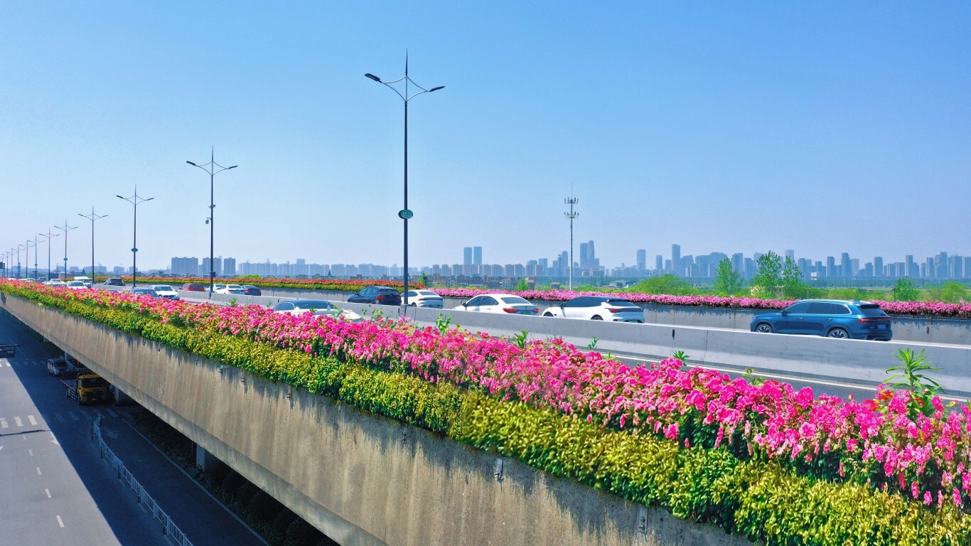 从高速互通至南桥亭,不到 14 公里的高架沿线,宛如一条铺展的生态花卷悄然绽放。两侧花箱错落有致,繁花次第铺陈;匝道曲线被层层花意温柔包裹,车行其间,目之所及皆是生机盎然。施工团队于细节处精雕细琢,无论是花材甄选、色彩搭配,还是安装工艺的严苛把控,每一处看不见的匠心,都在默默托举这份出行路上的美好,让高架不仅是通行之道,更成为城市一道流动的风景线。